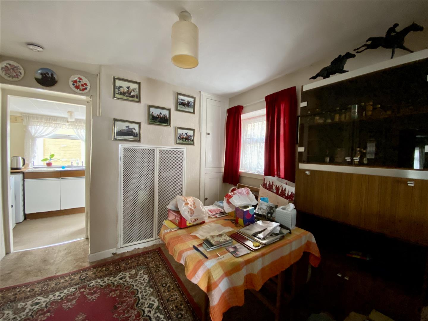 Window to side, stairs, door to Storage cupboard, open plan to Kitchen, door to: